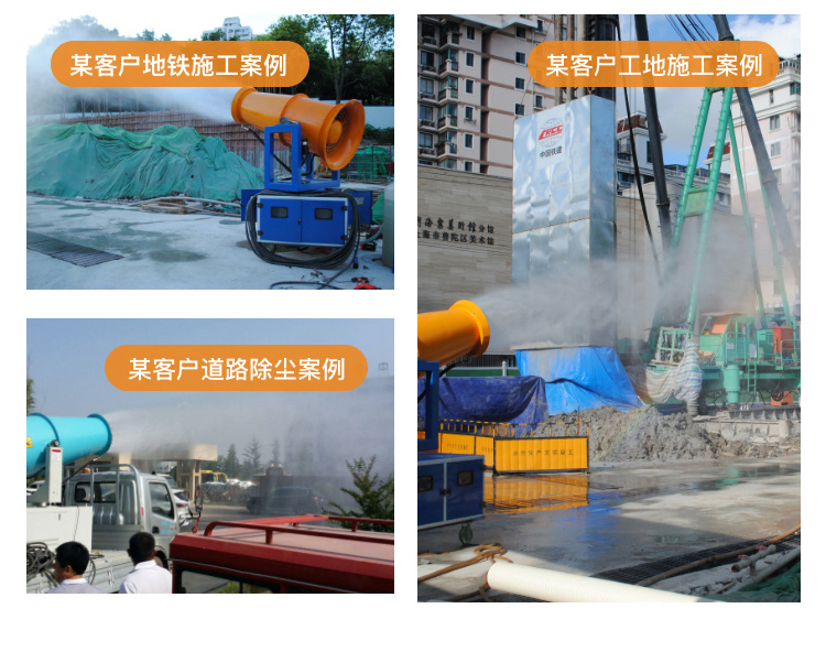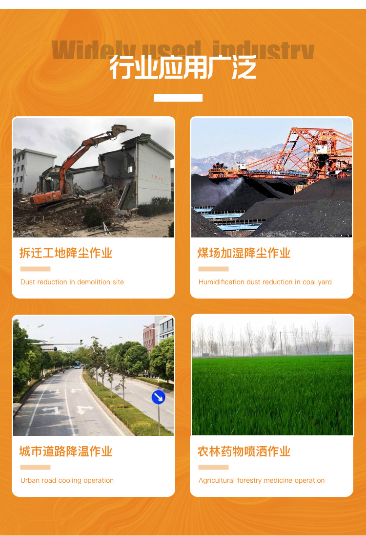 主要用途:適用于拆遷工地、冶金鋼鐵企業(yè)、采礦區(qū)域、煤化工企業(yè)、水泥廠、發(fā)電廠、建筑工地、物料和礦產(chǎn)主要適用于品露天堆放廠、混凝土處理廠、垃圾堆放場(chǎng)、垃圾焚燒廠、沙廠、干式物料倉(cāng)庫(kù)、露天爆破、重度粉塵區(qū)域。