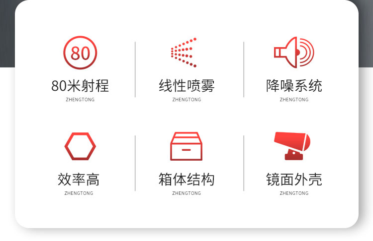 產(chǎn)品特點(diǎn):環(huán)衛(wèi)車配套霧炮機(jī)采用鏡面不銹鋼外殼,耐銹蝕易清潔,線性噴霧,射程遠(yuǎn)覆蓋范圍廣。