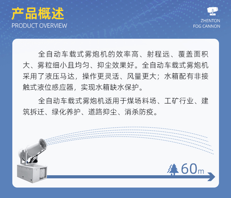 產品特點:60米全自動霧炮機的效率高、射程遠、覆蓋面積大、霧粒細小且均勻、抑塵效果好。采用了液壓馬達,操作更靈活、風量更大;水箱配有非接觸式液位感應器,實現(xiàn)水箱缺水保護。