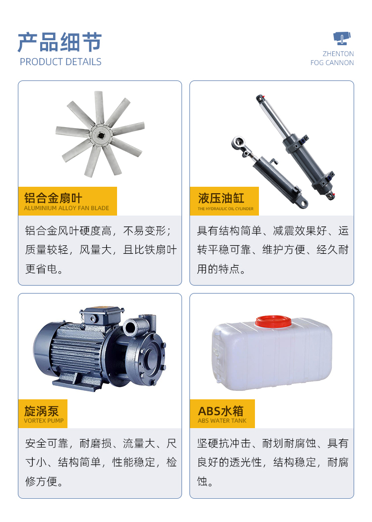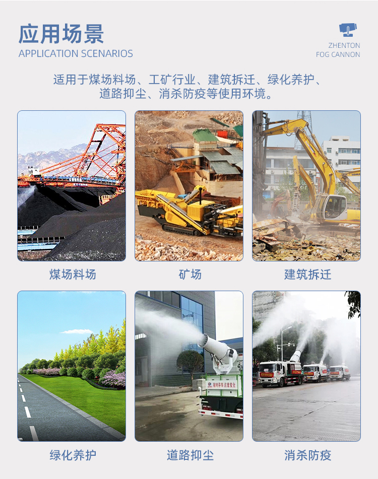 主要用途:建筑工地 煤場,工業(yè)除塵,農業(yè),園林綠化等飛機場、高速公路、車站、碼頭、公共場所、運動場地、炎熱場地等降塵保濕降溫消毒。