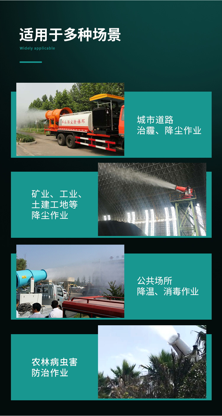 主要用途:用于煤礦場、城市拆遷工地、冶金鋼鐵企業(yè)、采礦區(qū)域、煤化工企業(yè)、水泥廠、火力發(fā)電廠、物料和礦產(chǎn)品露天堆放廠、混凝土處理廠、垃圾堆放場、垃圾焚燒廠、沙廠、干式物料倉庫、露天爆破、重度粉塵區(qū)域。