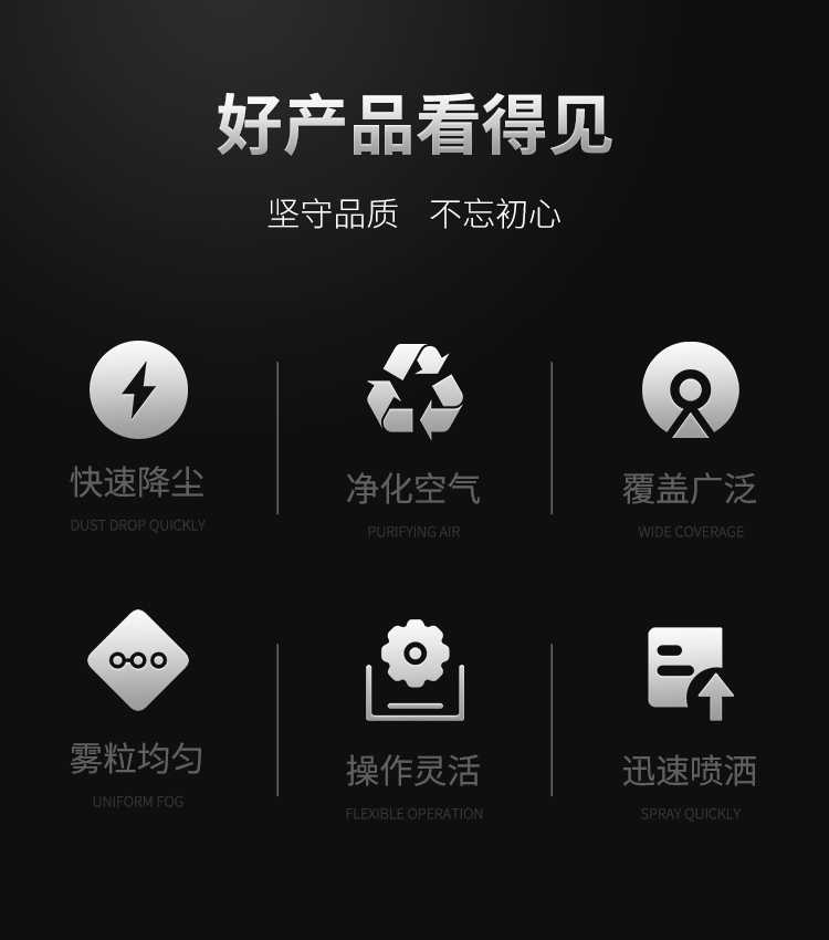 產品特點:70米抑塵霧炮機射程遠、穿透性強、覆蓋范圍廣,水霧顆粒細小、噴灑更加均勻、降塵速度快、工作效率更高。