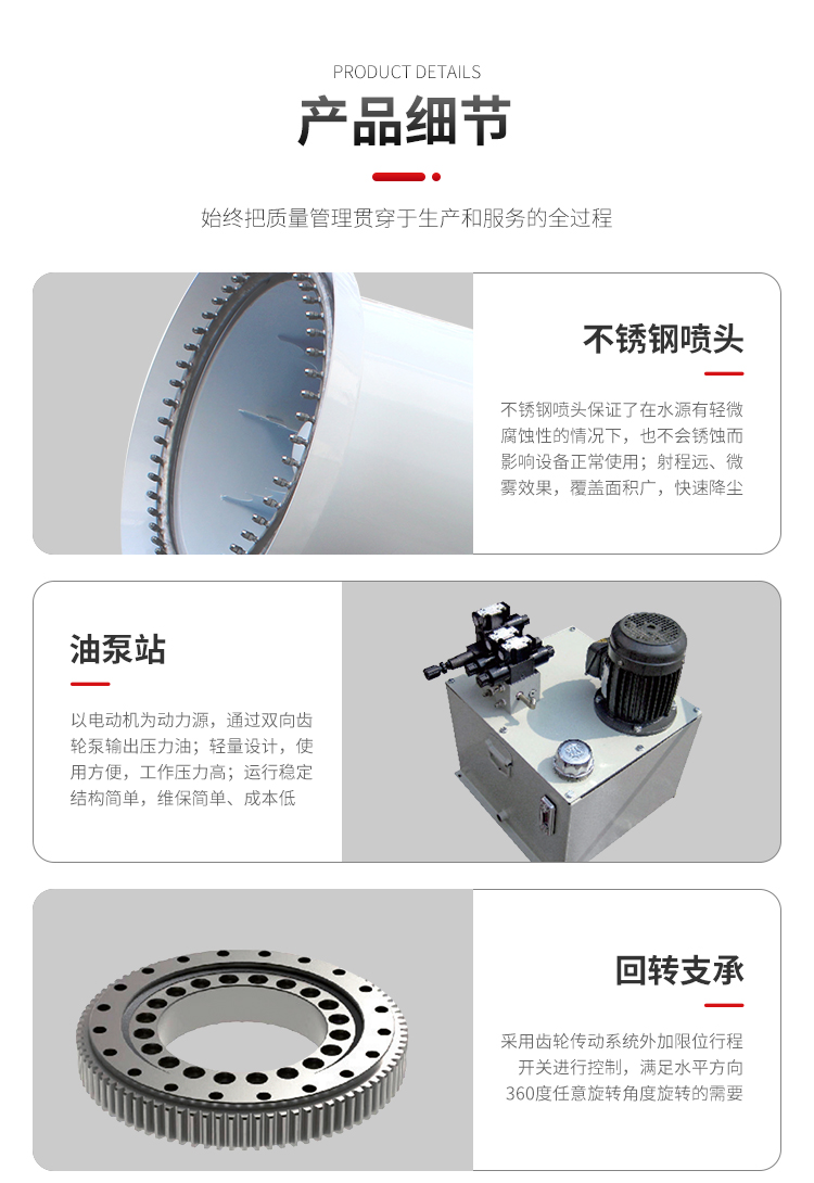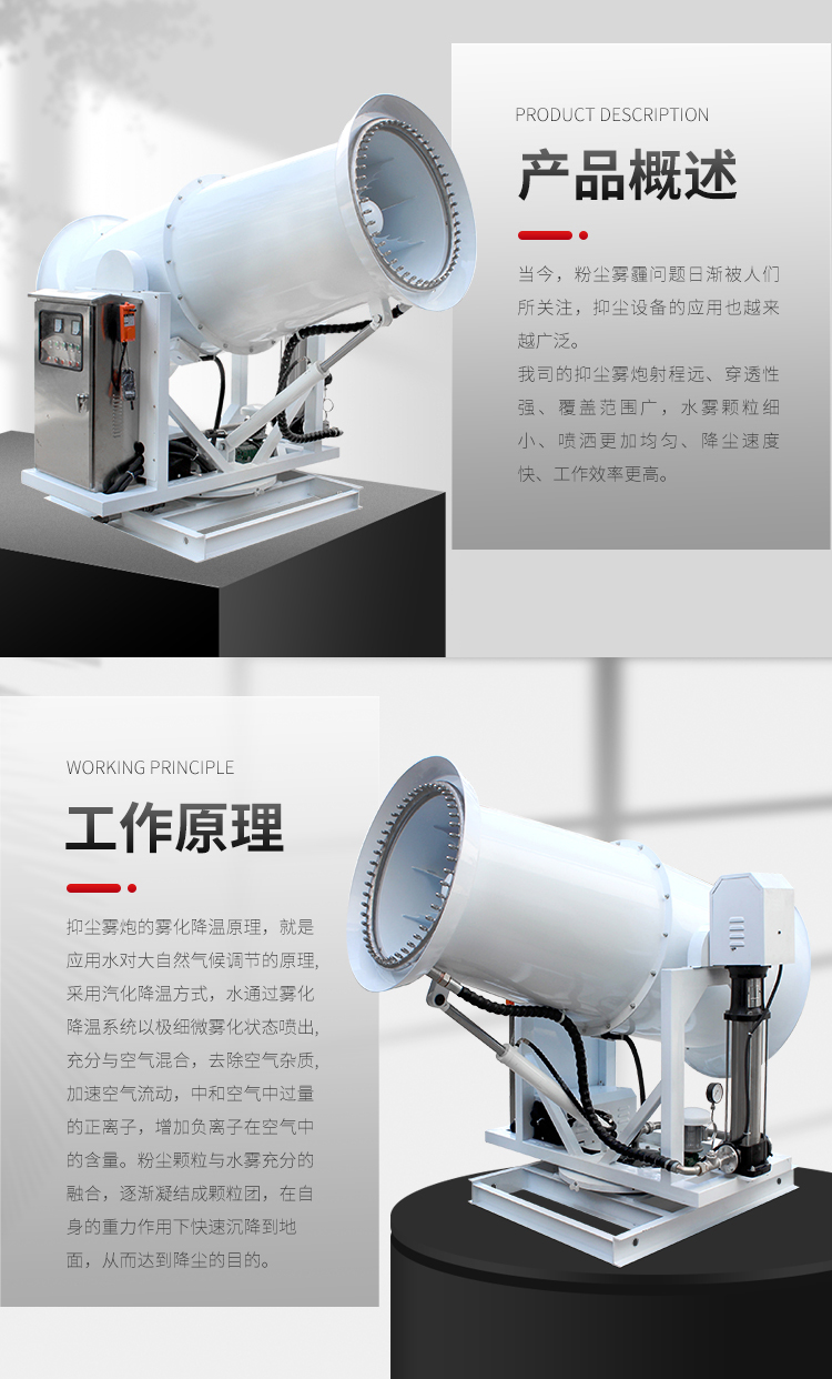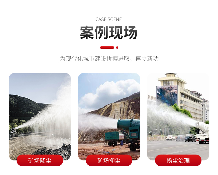 主要用途:用于城市拆遷工地、冶金鋼鐵企業、采礦區域、煤化工企業、水泥廠、火力發電廠、建筑工地、物料和礦產品露天堆放廠、混凝土處理廠、垃圾堆放場、垃圾焚燒廠、沙廠、干式物料倉庫、露天爆破、重度粉塵區域。