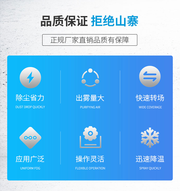 主要用途:車(chē)間通風(fēng)降溫、植被養(yǎng)護(hù)澆水加濕、垃圾站除異味、植物作物水肥藥物噴淋等。