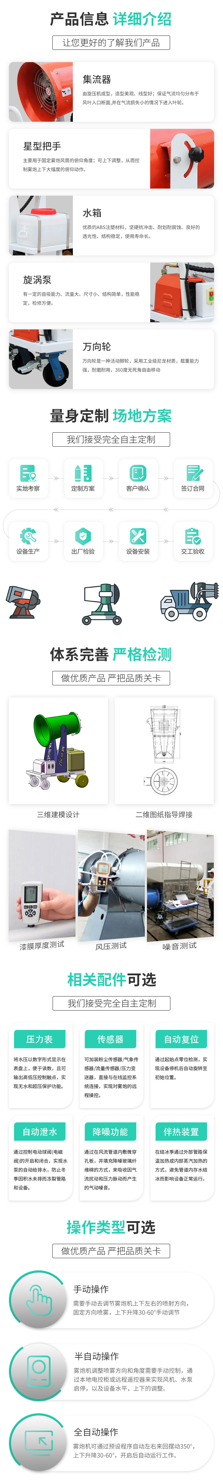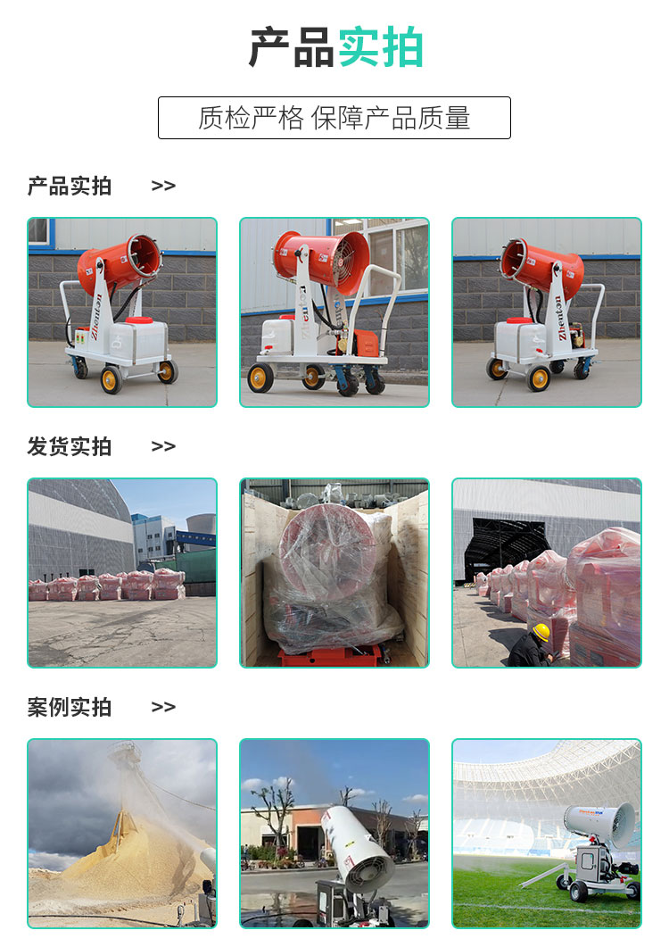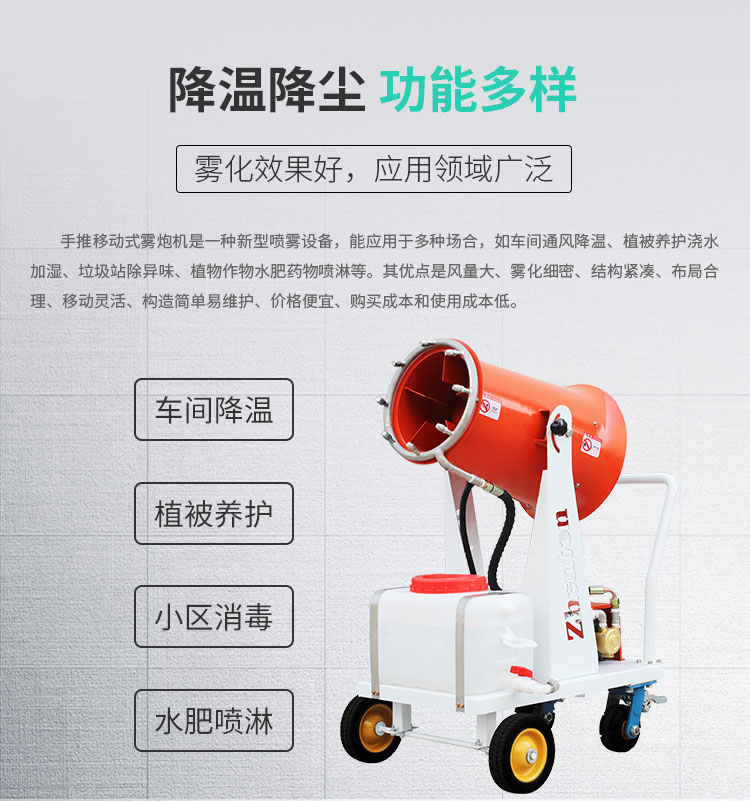 工地小型手推移動式霧炮機降塵速度快、風量大、機結構緊湊、布局合理、移動靈活、構造簡單易維護。