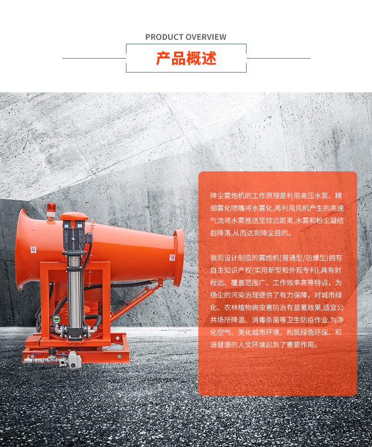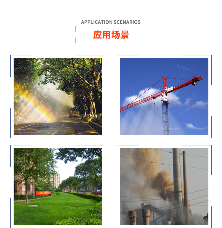 主要用途:用于煤礦場、城市拆遷工地、冶金鋼鐵企業、采礦區域、煤化工企業、水泥廠、火力發電廠、物料和礦產品露天堆放廠、混凝土處理廠、垃圾堆放場、垃圾焚燒廠、沙廠、干式物料倉庫、露天爆破、重度粉塵區域。