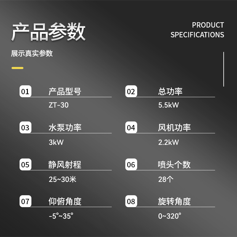 主要用途:大型果園噴藥、桉樹防治以及城市拆遷工地、冶金鋼鐵企業、采礦區域、煤化工企業、水泥廠、火力發電廠、建筑工地、物料和礦產品露天堆放廠、混凝土處理廠、垃圾堆放場、垃圾焚燒廠、沙廠、干式物料倉庫、露天爆破、重度粉塵區域。